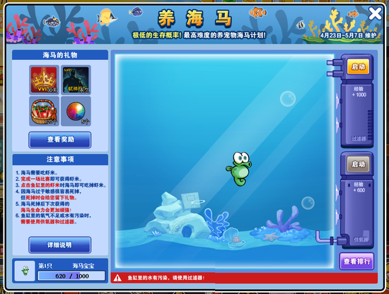 活动简介:活动中玩家要扮演一个小小饲养员,赢取超棒的礼物。但是海马拥有极低的生存概率,是很难养的宠物。