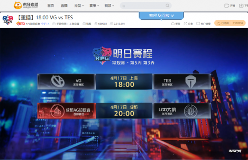 4月17日,虎牙KPL王者荣耀春季赛常规赛第五周第三日即将开战。首战TES迎战劲敌VG,第二场成都AG超玩会大战LGD大鹅,两支联盟最强战队的巅峰对决必将掀起新一轮腥风血雨。虎牙直播首推4K+60帧+20M超高清直播“三件套”,为全球用户独家提供 “大片级”的4K观看体验。更多KPL精彩赛事,请锁定虎牙直播660002,观赛还有iPhone Xs、珍贵皮肤、蓝牙耳机等好礼送不停~