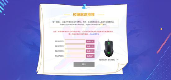 首先会有两个任务。任务一:社团发掘身边热爱DOTA2/CS:GO解说的同学,推荐他们的信息!每个电竞社可最多提交四名优质本校解说,每有一名你推荐的解说入选每周末官方赛事校园解说,即可获得任务奖品和积分。