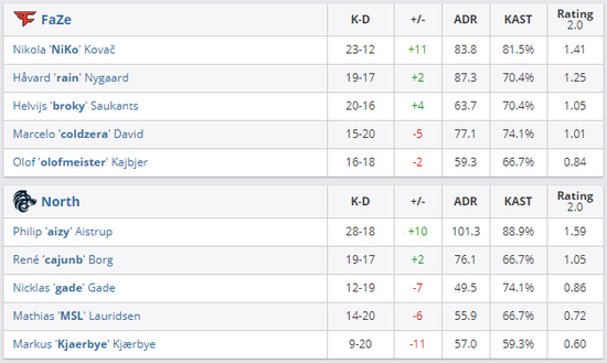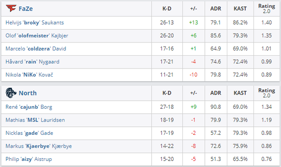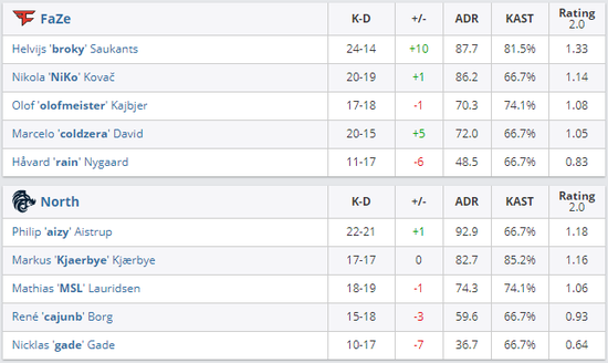 先做防守方的FaZe先发制人拿下了手枪局,长枪局虽然B区数度被North的快攻攻陷,但正面对枪很难取得优势的North还是有些举步维艰,几个关键残局也都没能把握住,各点开花的FaZe上半场取得大比分领先。下半场FaZe被连追七分,但手握大比分领先的他们在赛点局祭出一波放rain战术,顺利拿到最后一分以16-11拿下图一。
