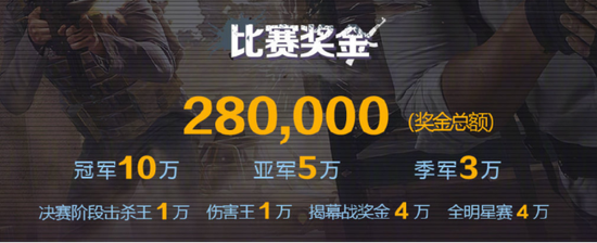 总奖金28万,冠军10万,亚军5万,季军3万,决赛阶段淘汰王,伤害王各1万,揭幕战和全明星奖金各4万
