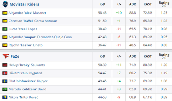 来到Mirage,Movistar Riders的队员保持良好的手感在开局取得优势,上半场双方打得有来有回,然而下半场开始FaZe众人突然像是觉醒一般,完美的防守站位没有给对手任何机会主A有大雨神,主B有broky,两人稳如泰山、岿然不动。凭借着如此这般铁血防守,他们16-9拿下图二。进入到Inferno,Movistar好像被打回原形,进攻方难以打开局面,防守更是一分不拿。FaZe这边3人超过1.3的rating宣告了比赛的结局。最终FaZe让一追二,成功翻盘。