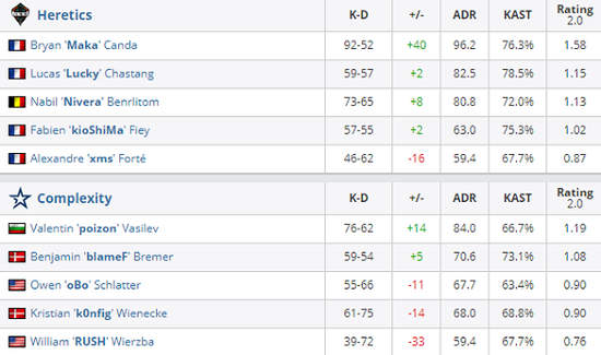 另一边是法国战队Heretics对阵新军Complexity,图一是Heretics主动选择的Nuke,他们在这张地图上的进攻完全碾压了对手,12-3的上半场比分,让你很难相信12是进攻的一方,Maka全方位暴走,全场轰下1.92的rating为法国队取得了良好的开端。图二Mirage,双方在Mirage上分别展示了自己进攻端的出色能力,双方都是进攻方拿分较多。