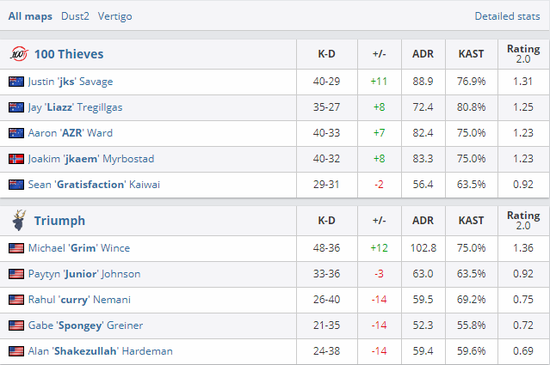 除去首轮的败绩,双J兄弟在北美区之后的比赛中从未让队友失望过。相较100T来说Triumph这支北美新秀太过年轻,没什么大赛经验的他们还刚刚换上黑人小伙curry,因此游刃有余的澳洲人越打越发放松。在CT方道具管理不足,对地图理解稍逊一筹控制力不足侦察又少是导致Triumph失败的根本原因,最终100T轻松以2-0的成绩拿下本日的比赛。