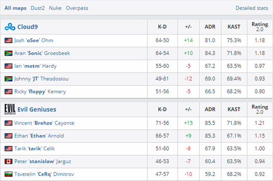 Cloud9 2-1 EG(Dust2 19-17;Nuke 8-16;Overpass 16-9)