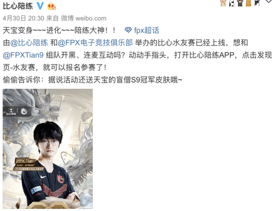 英雄联盟S9冠军打野、FPX战队队员tian,在线陪练教学,这个世界上没有他带不赢的队友,王霸之气侧漏。原来,FPX队员全员入驻了比心陪练,作为一名明星陪练官,小天此次活动为比心水友赛(明星带队 连麦开黑)的系列活动之一,只要在比心陪练报名,即有机会获得陪练资格。