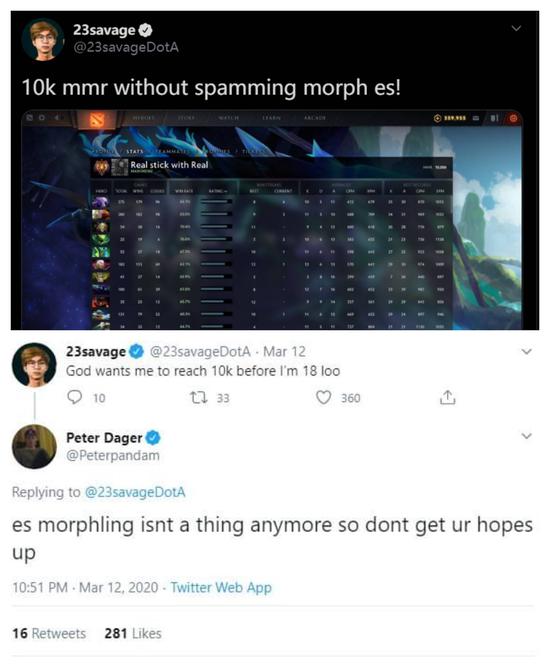 由于受到疫情的影响,本赛年剩下的几个大赛都被迫转移到线上进行。而在线上赛的间隙中,越来越多的职业选手开始重新把精力投入到天梯对战中。就在前几天,液体的一号位麦克刚刚成为第19个“万分大神”,这一次,23savage是紧随其后。谈到上分经历时,23savage还不忘记呛一句PPD——“不玩水人我也能上一万分”。关于23savage和PPD的故事,其实还要追溯到三个月前。当时,23savage在推特上许愿,“希望我能在18生日到来前上一万分”。评论区中,PPD居高临下地点评道,“(你最擅长的)水牛已经被砍废了,所以就别抱希望啦!”。简单地浏览了一下他的冲分记录,23savage算是用实际行动打了PPD的脸。