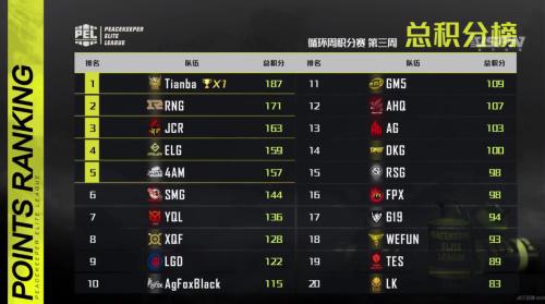 2020PEL和平精英职业联赛S1常规赛第三周已经结束,天霸凭借出色稳定的发挥,夺得了第三周周冠军。