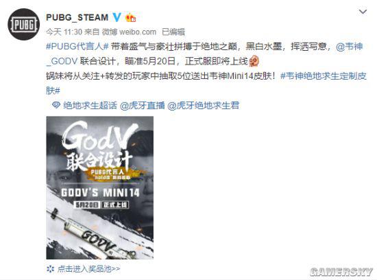 今日,《绝地求生》(Steam)官方微博发布消息,官方将推出与韦神GODV联合设计的Mini 14定制皮肤,皮肤将于5月20日在正式服上线。