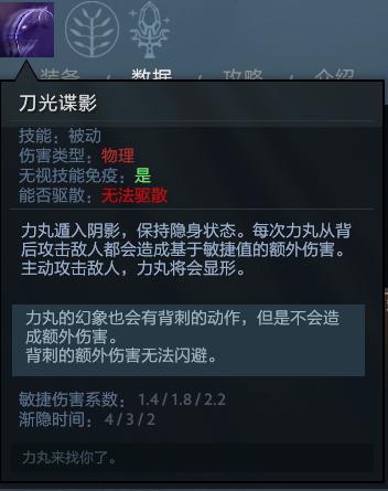 永久隐身,当SA攻击敌人背部时将造成敏捷相关的额外伤害。学了这个技能之后SA的输出将产生质变。