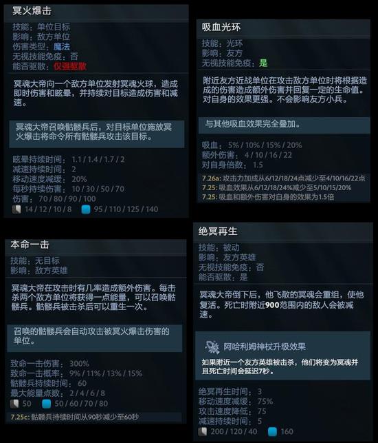 骷髅王的4个技能都很简单,1技能带眩晕的锤,前期主要输出技能和Gank技能,中后期主要输出环境技能;2技能光环团队共享,下除吸血外还增加攻击力,不过只对近战生效,同时对骷髅王自己有1.5倍效果,增加赖线续航,以及推塔能力,3技能是低概率、高倍率的暴击被动,可以积攒能量,主动使用时可以产生骷髅兵,没有天赋最多8只,点了天赋最多14只。大招重生原地复活,有5s减速效果,间隔也够使用跳刀逃命,前期冷却时间非常长1级CD3分钟,并且有一定消耗,只有点了天赋才不耗蓝,带盾的第一命会让大招进入CD,盾不会掉。