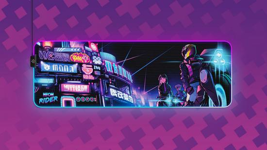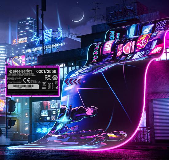 QcK Prism XL Neon Rider霓虹骑士限量版鼠标垫拥有900mm x 300mm的超大尺寸,可同时为键盘、鼠标提供支撑。其表面图案同样经过了重新设计,除熟悉的头盔元素外,增加机车、霓虹城市等精美背景,结合鼠标垫四周的RGB炫彩灯光,相得益彰。与Sensei Ten霓虹骑士相比,QcK Prism XL霓虹骑士产量更加稀少,十分值得入手。