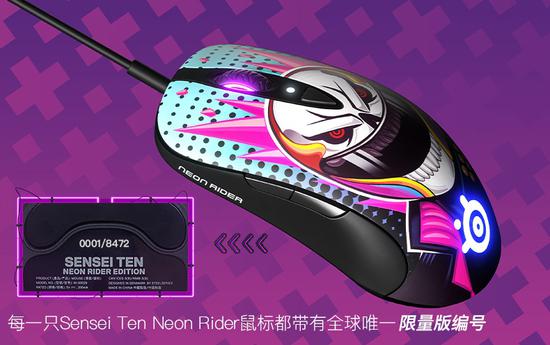 Sensei Ten Neon Rider霓虹骑士限量版游戏鼠标对皮肤进行了重新设计以匹配其经典的对称造型;在采用全新涂装的同时,鼠标在触感方面没有任何变化,依旧非常舒适;底部标有全球唯一限量编号;结合顶尖的鼠标性能,无疑将成为玩家不可多得的限量珍藏。