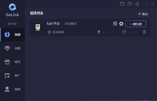 下载epic客户端后。打开Golink免费加速器,选择Epic平台,点击一键加速