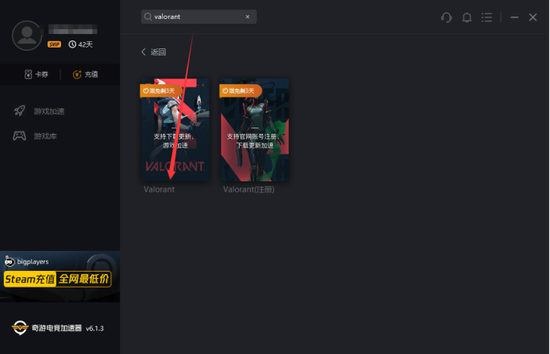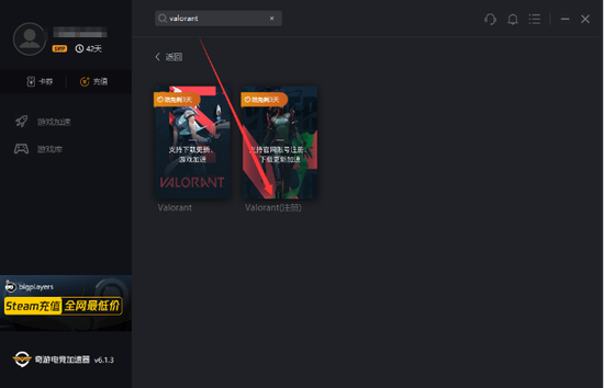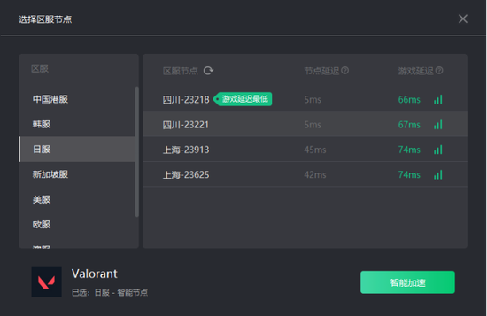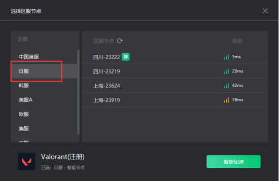 用奇游加速器切换“Valorant”分区,加速日服(小编先前注册的是日服账号,所以这里选择加速日服),避免登录不上和错误代码问题、有效降低延迟: