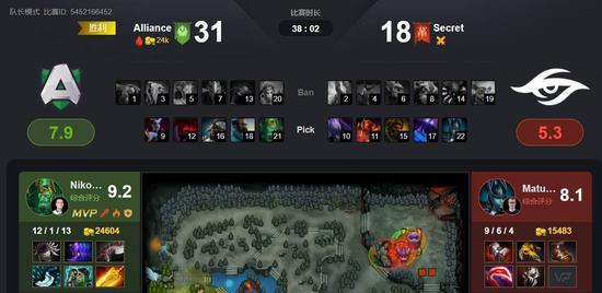 秘密打Alliance的第一把,比赛还是熟悉的秘密碾压节奏。从BP阶段就不难看出,秘密压根没把Alliance放在眼里——一选熊德,就问你有什么问题!最后两手,秘密又拿出了Zai的亚巴顿和Nisha的水人,再加上Puppey的小鹿,一套中期发力的推进阵容跃然纸上。对线期,操刀熊德的马桶哥在优势路把S4的龙骑士打的不敢占线。九分钟经济落后三千块,感到大事不妙的A队众人试图跟着Limmp的DP拔掉秘密的外塔。中路一塔的争夺,秘密不但完成反补,还换掉了A队的两个酱油。13分钟拿到金箍棒,马桶哥开始发力。两分钟后的河道团战,熊德将DP和龙骑士一网打尽。另一个战场,Niko的隐刺尽全力拼掉了亚巴顿,但自己也是难逃一死。