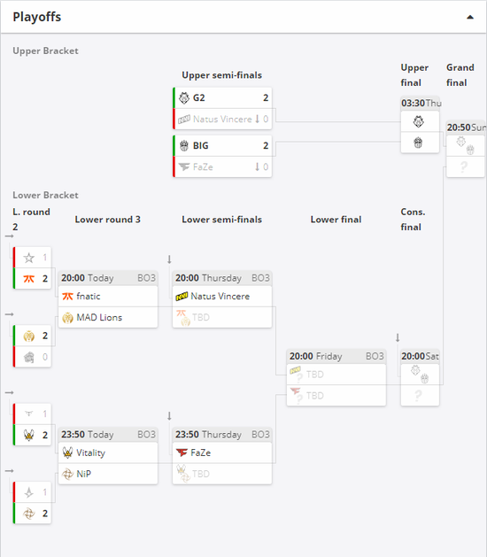 在昨晚进行的DH春季大师赛胜者组中,NaVi与FaZe这两支状态慢热的队伍双双发挥失常,惨遭对手2-0击败掉入败者组之中。而G2则携手BIG成功晋级胜决,准备向最终的决赛名额发起冲击。