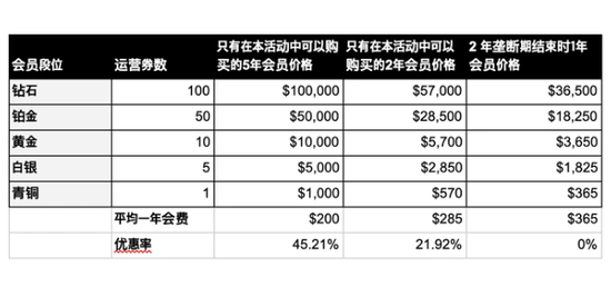 本次运动中销售的会员权利分别有5年券,2年券两种。