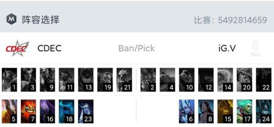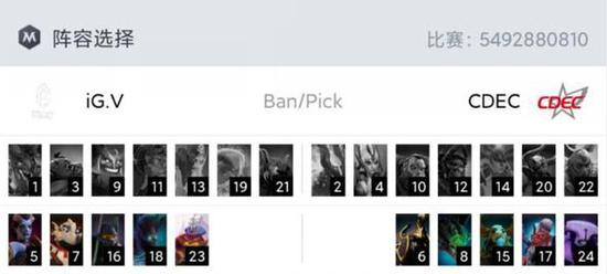 CDEC在天辉方,iG.V在夜魇方。CDEC选择玛尔斯、剃刀、卓尔游侠三核,凤凰、祸乱之源辅助,在取得线优,快速成型后,中期推进。iG.V在夜魇方,拿出了四保一幻影刺客阵容,死亡先知、米拉娜、沙王、复仇之魂,为幻影刺客拉扯空间。iG.V五人开雾开局入侵天辉方击杀祸乱之源取得一血,又通过逼走位,取得了三符开局。