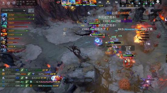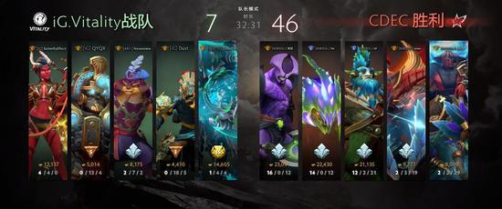 37分钟,CDEC拆掉了夜魇上路兵营后,iG.V追出来殊死一搏,幻影刺客跳过来就被祸乱之源魔爪控住,卓尔游侠输出点杀,剃刀刷新BKB大招,顶在前面,死亡先知只能后撤,但iG.V最终谁也没跑掉,被打了一波五人团灭,iG.V直接打出GG,CDEC赢下了第一局。