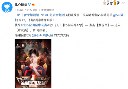 比心陪练是AG超玩会赞助商,AG超玩会选手早已全员入驻比心陪练。此次蓝柚水友赛赛前,梦泪、一诺、老帅等选手们也纷纷发布比心动态上为柚子哥水友赛宣传打call,号召大家参与。