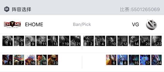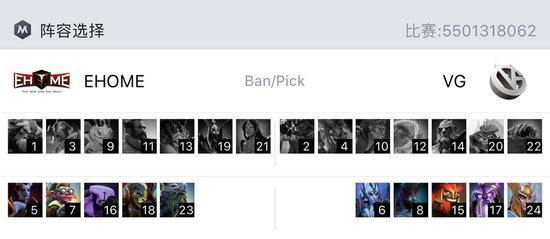 VG点出凤凰,之后拿出版本之子TB配VS组合。EHOME这边则是一手女王,并用老奶奶克制凤凰,接着VG用帕克限制对手滚滚、女王的发挥。最后一选EHOME在剑圣被ban的情况下拿出小狗打蛋,而VG直接用大鱼意图线上打爆小狗。
