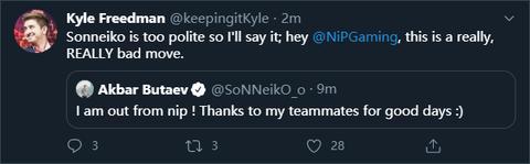 日前,前Team Empire和HellRaisers经理Korb3n在推特上表示:NiP已经将队内的SoNNeikO踢出队伍名单,甚至没有与选手本人讨论。根据他的说法,NiP还将队伍原来的经理开除,取而代之的是前不久刚刚解散的OG.Seed的经理。SoNNeikO本人也在推特上表示他将离开NiP,但是他没有透露离开的原因,只是表示感谢自己的前队友。而NiP方面也没有做出相关解释或是离队声明。
