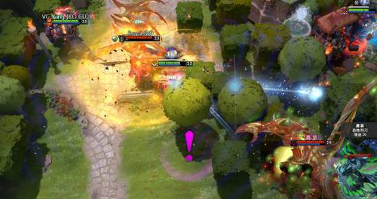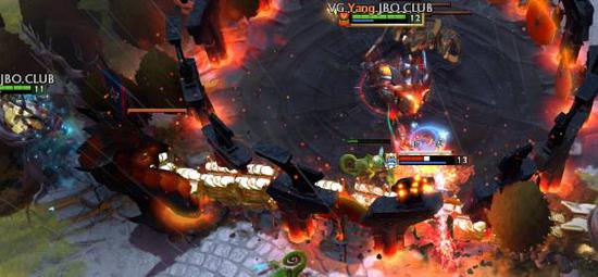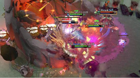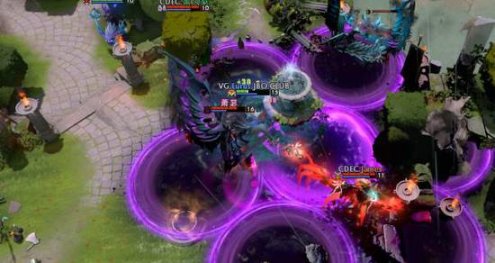 迫于TB的压力,CDEC也不敢盲目开团。拖到肉山重新刷新,双方在32分钟再次展开对峙。两边都不敢打盾,VG在中路主动开团——Pom隐身偷袭,牛头跳大,Ori的紫猫完美衔接,VG把猴子秒了。乘胜追击,之后的野区混战,TB变身大恶魔,CDEC交出了猴子的买活也不是东风神的对手!TA也买活了,但CDEC越不过TB这道城墙!同一时间,Ori干扰了AME的判断。想切后排的猴子被VG的后排英雄反杀,而TB却在CDEC的人群中屹立不倒!