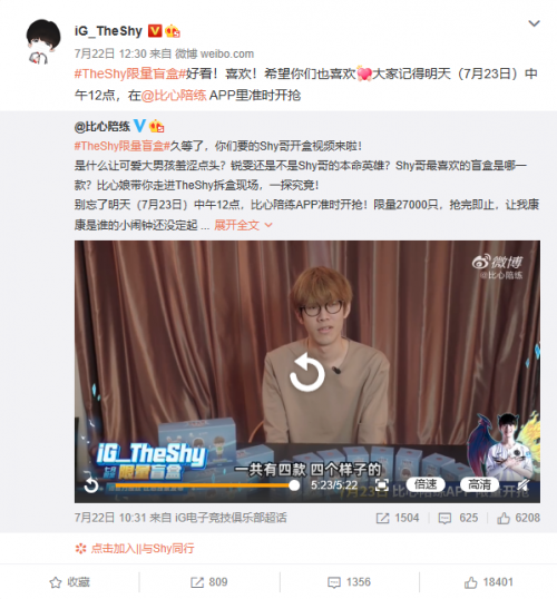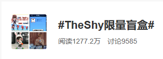 7月23日,比心独家推出“少年天神”系列TheShy个人盲盒,一经发布就受到粉丝热捧。上线一周以来热度丝毫未减,目前出货成功突破两万,话题#TheShy限量盲盒#在微博上的阅读量高达1200+万。