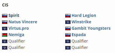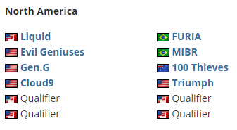 北美和独联体区将各有12支参赛队伍,其中8支队伍将根据目前的排名直接获得邀请,其余4支队伍则来自未公布的预选赛阶段。届时,所有地区都将以小组双败开始,而后进入单败淘汰赛。目前独联体及北美地区阵容如下,欧洲地区参赛名单尚未透露。