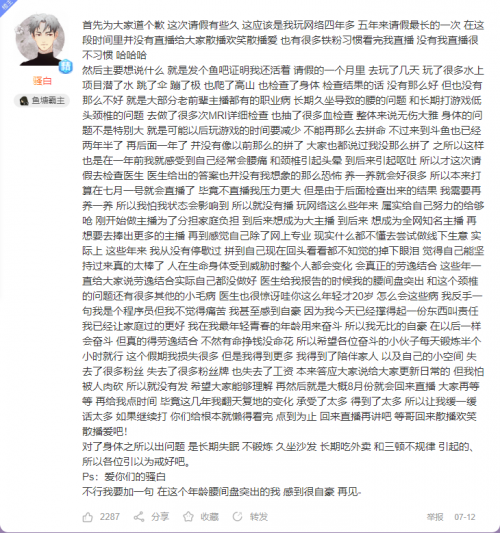 正当观众们以为这样的快乐会持续下去的时候,骚白却在2020年6月的时候突然宣布自己要停播一段时间。到七月更是发了一篇长长的文章告诉观众们原因,是因为骚白每天都想要多陪观众们一会,为了观众们牺牲掉了自己很多休息的时间。再加上天天坐着直播,很少锻炼。忙起来的时候也只能吃外卖,生活不规律,所以需要适当的放松自己。最后还很调皮的调侃自己为:腰间盘突出。同时骚白也透露了自己将会在8月份回归。