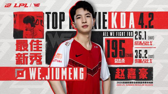 WE战队ADC选手Jiumeng获得常规赛最佳新秀荣誉。