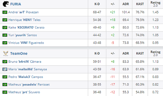 巴西内战的图一来到Train,先做防守的FURIA上半场9-6的比分只能说是中规中矩,好在下半场在arT凶狠的突破下直接带走了比赛。进入到图二,FURIA就感觉事情就不像上一张图那么顺利了,在TeamOne的横冲直撞下黑豹倒了下来。双方进入决胜图,在Nuke上先做CT的FURIA利用这个优势在气势上压过对手,最终16-7结束比赛。