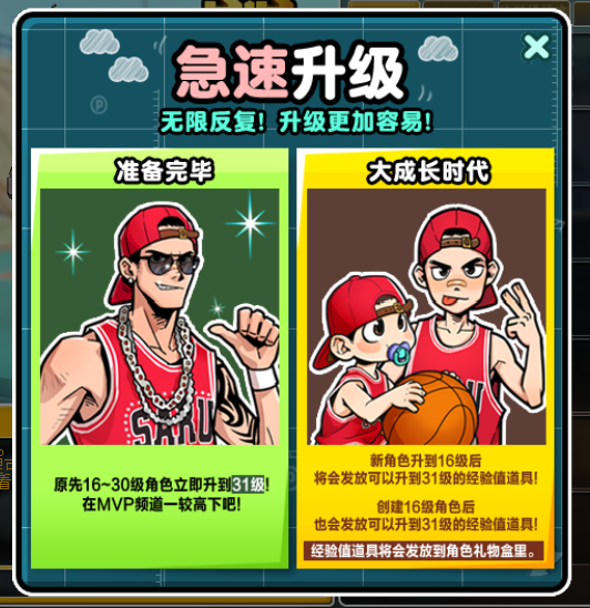 截止至8月20日服务器维护时,处于16~30级的角色在维护后全部提升至31级。8月20日服务器维护后,创建的16级角色,创建的20级角色,以及正常提升至16级的角色,会在角色礼物盒内收到直升31级的经验卡,使用后可以直接提升至31级。急速升级活动会在关闭的前一周通过公告形式告知玩家。