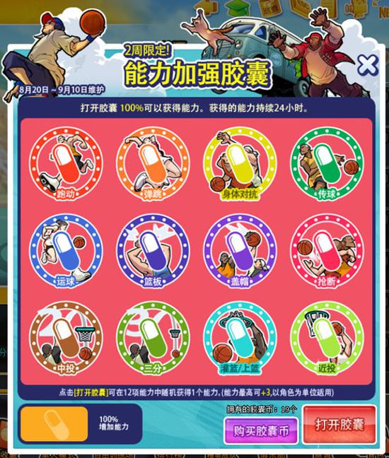 8月20日服务器维护后—9月10日服务器维护前,打开胶囊100%可获得能力,胶囊能力持续24小时。点击“打开胶囊”可在12项能力中随机获得一个能力增加1~3。