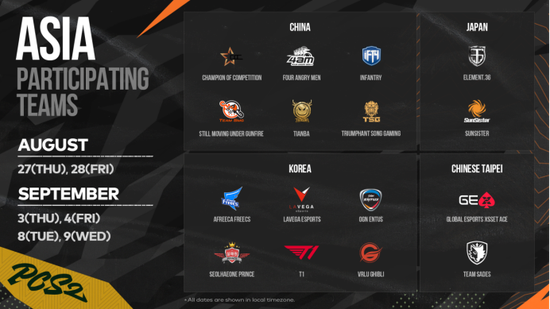 随着PKL赛区预选赛的圆满结束,本次参加PCS2东亚洲际赛的16支队伍全部出炉。和PCS1东亚洲际赛相比,每个赛区的参赛队伍都发生了变化,其中PKL赛区最为明显,只有ENF一支战队是参加了上一届的比赛。PCL赛区也更换了三支队伍,分别是最近势头正旺的COC战队、“四大名捕”TSG战队和老牌强队SMG战队。PJS和PML赛区都各自更换了一个队伍,其中PML赛区中CRS战队重回PCS赛场,他们曾在PCS东亚慈善赛上勇夺季军,这支由上班族和学生组成的战队这次是否会给我们带来更大的惊喜呢?期待这16支队伍在本次PCS2东亚洲际赛上赛出水平,赛出风采!