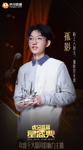 18年虎牙星盛典上,孤影被评为年度十大最具影响力主播,被王者荣耀官方评为年度优秀合作主播。“陌上人如玉,孤影世无双”的称号被越来越多的王者玩家熟知,与此同时众乐互娱还发现了这位少年身上无数的可能性。