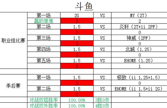 研究数据发现,斗鱼战队从职业组比赛开打到季后赛七战全胜,几乎没有遇到什么阻力,而且赢下来的比赛,几乎都是四局之内解决战斗,很难有队伍可以和斗鱼战队打到第五局比赛,如此恐怖的数据,让小编也为之一振。此次总决赛面对北城战队(之前斗鱼战队三比零赢过北城战队),满状态的斗鱼三人胜面很大,小编十分看好斗鱼战队能赢下首轮对决。预测比分3比1战胜北城。