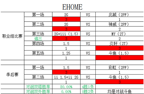仔细研究数据后小编发现,EHOME在对阵双塔阵容时,胜率有80%,几乎是不惧任何双塔阵容,就连总决赛首轮面对的彩虹战队,也曾在季后赛中3比1战胜过,所以小编综合数据分析,EHOME首轮对战彩虹战队大概能拿下对手,比分预测3比1。但是EHOME战队在面对双外时,两场全负,胜率0%,对战的都是斗鱼战队,而且EHOME尝试过变阵解决问题,但是效果都不好,都是3比1负于斗鱼战队,所以今年EHOME战队想要拿下职业联赛总冠军,斗鱼战队就是最大的阻碍。小编分析,EHOME很有可能与ONESTAR战队在败者组第二轮相遇,但是两支战队想要夺冠都要想好应对斗鱼战队的策略。