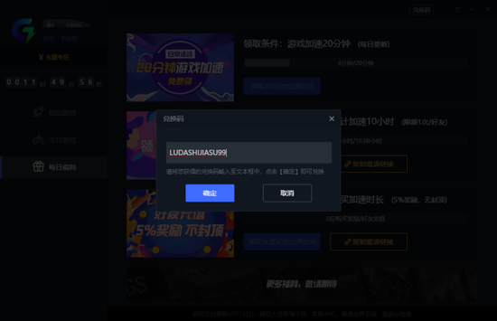 2.同时为了回馈用户,现在凭借兑换码【LUDASHIJIASU99】还能领取9.9小时免费体验时间;