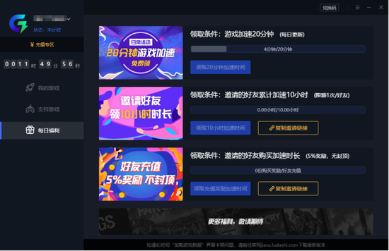 4.邀请好友使用,好友累计加速10小时后自己也可以领取10小时加速时间。