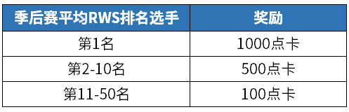 >本届联赛结束后,将从不朽级队伍中选出平均RWS前50的选手送出完美点卡奖励,弃赛玩家取消获奖资格。(RWS相同时按照总比赛场次排名、总比赛场次也相同时按照击杀数排名)