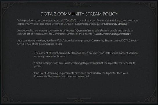作为社群的一员,您已获得Valve的许可来创作DOTA2赛事相关的社群直播,但必须遵守下列所有规定: