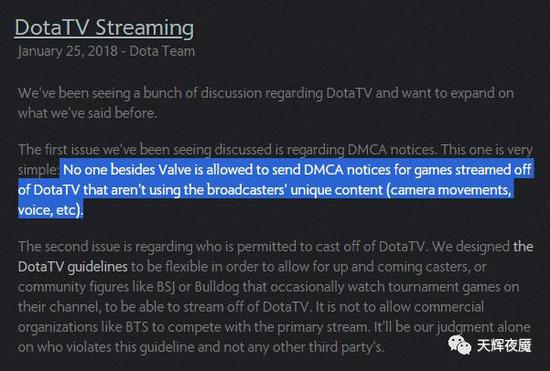 1. 除了Valve,任何人无权向不使用主办方独家内容(如摄像机运动,声音等)的通过DotaTV直播的行为发送DMCA通知