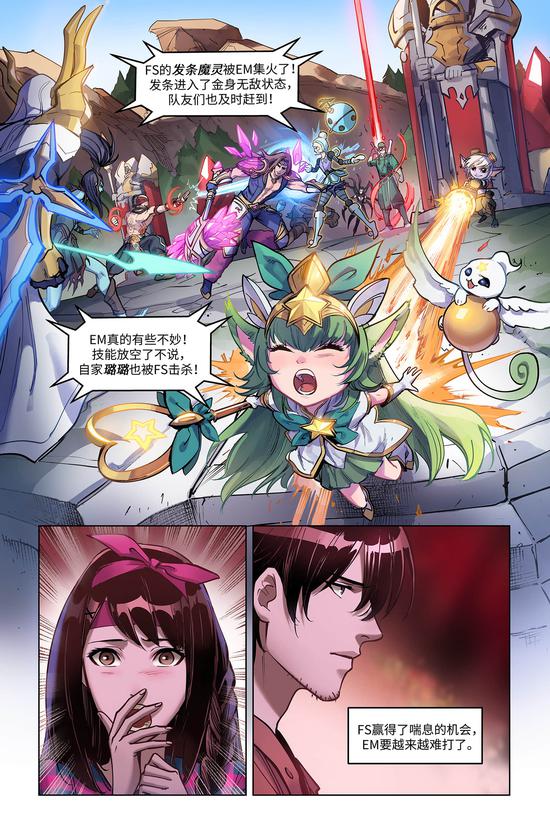 比如,在该漫画第二话的故事中,有一场“不痛不痒”的比赛。但是,我们却能够从漫画所刻画的英雄身上,深刻感受到当时团战的激烈程度。特别是当“自家璐璐也被FS击杀”时,我们也能够从璐璐的表情上感受到这个英雄的“痛苦”。
