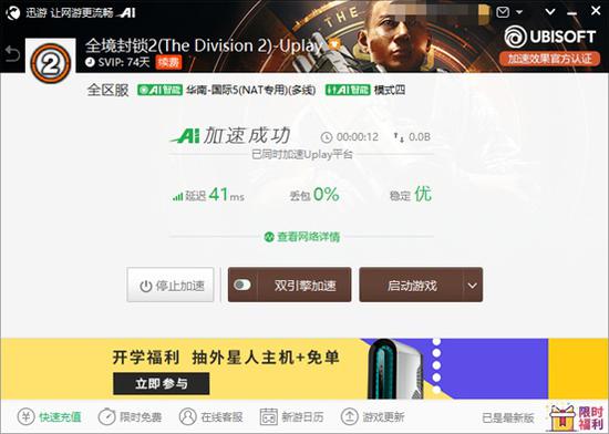 《全境封锁2》免费周末活动即将开启,各位玩家做好准备了吗?如果遇到下载限速以及游戏延迟过高和卡顿等问题时建议大家使用迅游加速器进行加速解决。迅游加速器采用军工级专线运输游戏数据,保障玩家们的游戏数据直达服务器,有效帮助玩家解决网游遇到的掉线、丢包、卡顿和延迟高等问题,助力各位玩家流畅游戏。