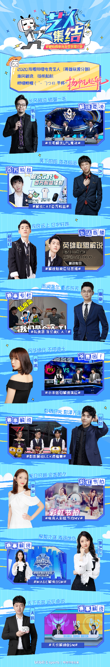 在众多艺人解说中有,自2012年便出现在观众视野中资历最老的lpl头部解说长毛, 2019年最佳新人主持/解说奖的获得者解说cat,及堪称是S系列赛永不磨灭的记忆的解说小米等一系列优秀的主持解说。众多风格各异的优秀主持解说的加入,让哔哩哔哩电竞在电竞领域布局更进一步。