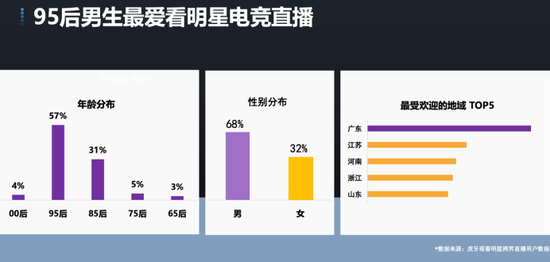 用户画像方面,观看明星电竞直播的多位男性,占比高达68%,且有一半以上均为95后人群,其次是85后用户。相对于虎牙平台整体的用户数据男女比例来说,观看明星电竞直播的女性用户占比有一定提升。而在地域TOP5中,依次是广东、江苏、河南、浙江和山东。