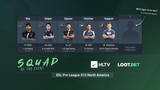 HLTV根据Fantasy系统,统计了本次赛事北美赛区各个位置上的最出色选手。(该数据仅仅来源于HLTV对选手赛场各项数据的加权统计,并不能完全代表选手实力、队内位置分配以及赛场表现。)
