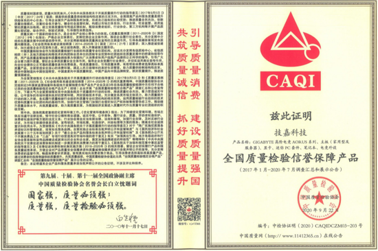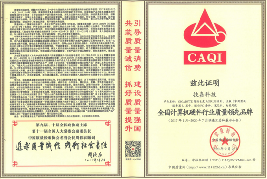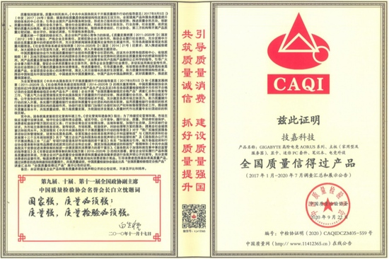 2020年9月,中国质量检验协会积极响应2020年全国“质量月”活动号召,组织2000余家企业开展“企业质量诚信倡议”专题活动。技嘉科技积极响应参与,并在活动中,获得《全国计算机硬件行业质量领先企业》、《全国质量信用优秀企业》、《全国计算机硬件行业质量领先品牌》、《全国质量检验信誉保障产品》、《全国质量信得过产品》共五项荣誉称号。